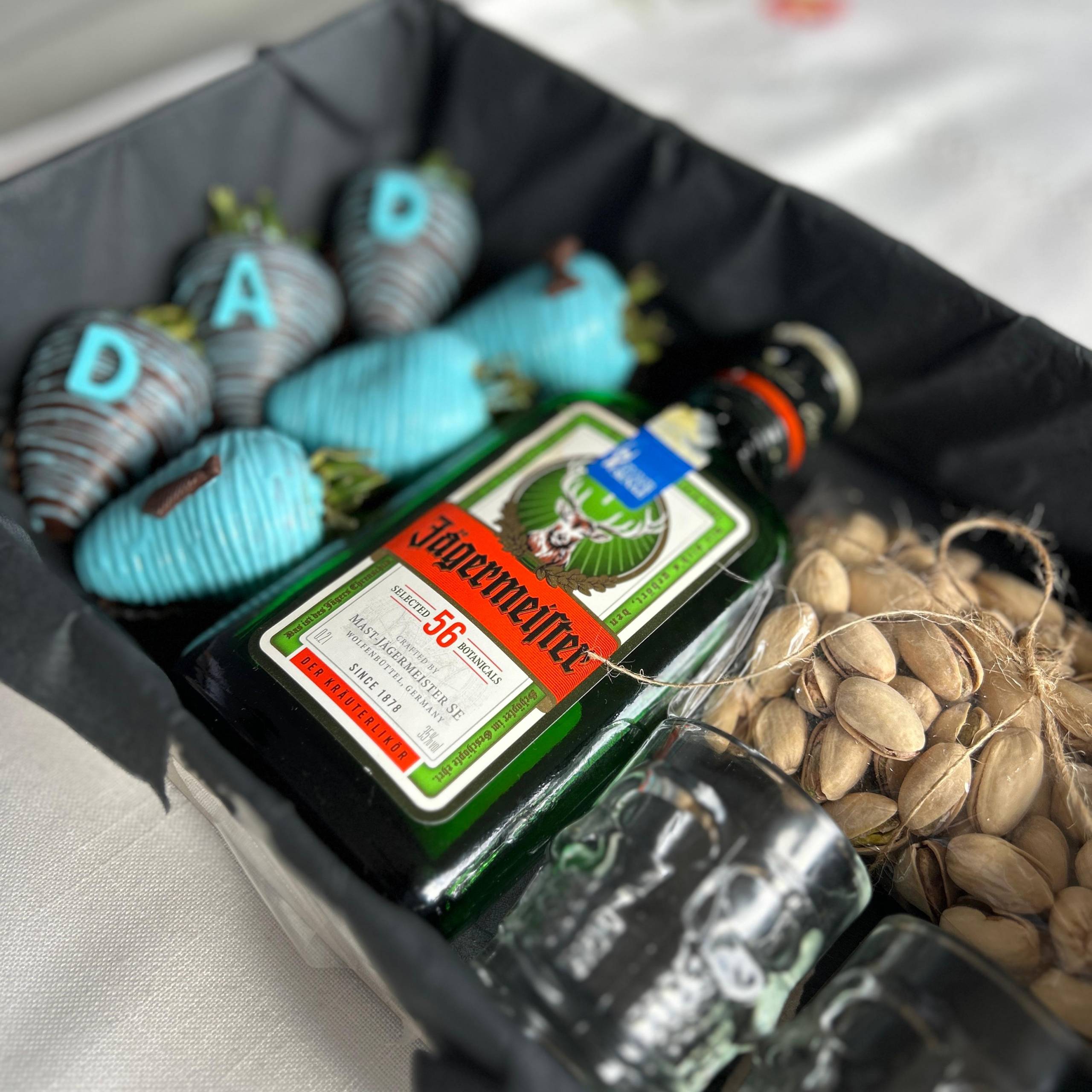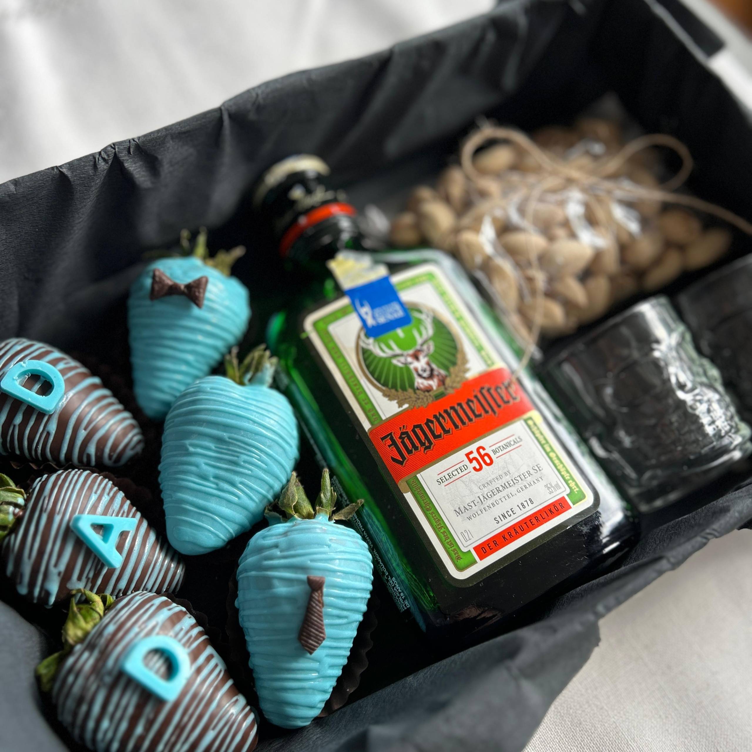6 fresas/ jaggermaister de 200ml/ pistachos/ 2 shots